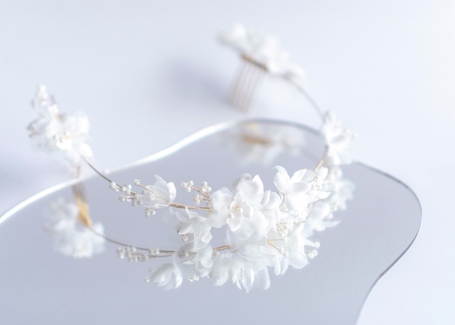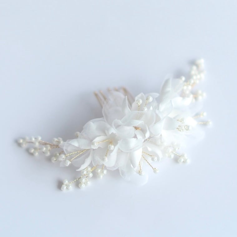 王道のシニヨンヘアに沿うように美しいカーブを描いたブライダルフラワーコーム。 360度どこから見ても華やかで美しい。 優しく上品な艶のあるコットンサテンと透明感のあるオーガンジーの花びらがスタイリングに奥行きと上質な華やかさをプラスします。 [カラー] ナチュラルホワイト×ゴールド ナチュラルホワイト×シルバー セミオーダーも可能です。 サイズやお花の色変更などご要望をぜひ詳しく教えて頂ければと思います。 下記LINEにてお気軽にご相談くださいませ。 [サイズ] コーム飾り→約5cm×18cm Uピン飾り→約4cm×8cm [素材] ・綿サテン、オーガンジー ・シードビーズ ・アーティスティックワイヤー ・真鍮メッキ [送料、配送について] 千葉県より発送。 送料一律500円(ラッピング込み) お客様の大切な商品の為、サイズに関わらず ゆうパック、または宅配便にて発送させて頂きます。 ※混雑状況によりますが即納品は通常2〜3営業日で発送させて頂きます。営業日をご確認ください。 予約品やセミオーダーにつきましては2週間程お時間を頂きます。 いずれもご購入後、発送予定日をご連絡させて頂きます。 お急ぎのお客様は必ずご購入前に公式LINEにてご相談ください。 作業日程を調整させて頂きます。 ご相談、ご質問等はお気軽に公式LINEへどうぞ お問合せ公式LINE→ https://lin.ee/wWJWfhy