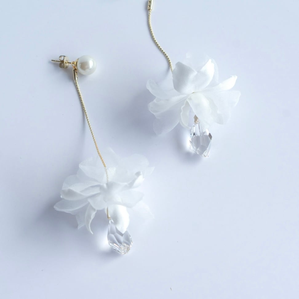 白鳥のように美しく揺れるブライダルイヤリング/ピアス。 優しく上品な艶のコットンサテンに透明感あるオーガンジー、透き通る氷のように輝くクリスタルガラス。 1枚1枚コテ当てし作り出す花びらの柔らかな曲線、クリスタルの美しい透明感がスタイリッシュでありながら優雅な印象をプラスしてくれます。 [詳細] ピアスタイプの揺れるチャームは取り外し可能です。 イヤリングタイプは取り外しができません。 ピアスタイプはアレルギー対応金具が選べます。 ・ゴールド:サージカルステンレス+ニッケルフリー加工 ・シルバー:サージカルステンレス ※チェーンはアレルギー対応ではございませんので重度のアレルギーの方はお気を付けください。 [カラー] ナチュラルホワイト×ゴールド ナチュラルホワイト×シルバー セミオーダーも可能です。 長さ変更、お花のサイズや色変更など、ご要望をぜひ詳しく教えて頂ければと思います。 下記LINEにてお気軽にご相談くださいませ。 [サイズ] 約3.5cm×8.5cm [素材] ・綿サテン、オーガンジー ・クリスタルガラス ・樹脂パール [送料、配送について] 千葉県より発送。 送料一律500円(ラッピング込み) お客様の大切な商品の為、サイズに関わらず ゆうパック、または宅配便にて発送させて頂きます。 ※混雑状況によりますが即納品は通常2〜3営業日で発送させて頂きます。営業日をご確認ください。 予約品やセミオーダーにつきましては1〜2週間程お時間を頂きます。 いずれもご購入後、発送予定日をご連絡させて頂きます。 お急ぎのお客様は必ずご購入前に公式LINEにてご相談ください。 作業日程を調整させて頂きます。 ご相談、ご質問等はお気軽に公式LINEへどうぞ♡ お問合せ公式LINE→ https://lin.ee/wWJWfhy
