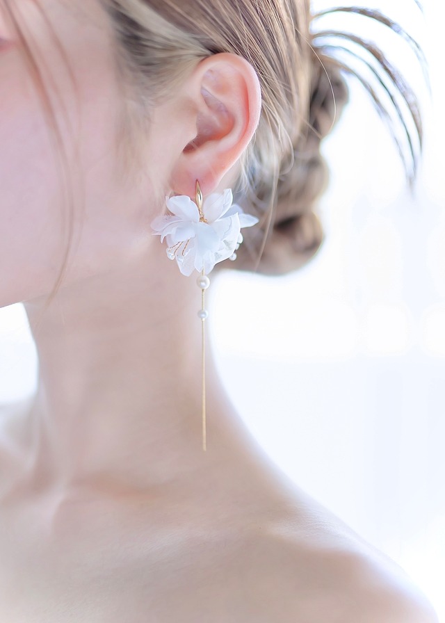 1枚1枚コテ当てし作り出される美しい曲線の花びらが上品に揺れるブライダルイヤリング/ピアス。 ジャスミンの花のように控えめでありながらも繊細で優美な存在感を放つデザインが、スタイリングに凜とした美しさをプラスします。 [詳細] ピアスタイプのチャームは取り外し可能です。 イヤリングタイプは取り外しが出来ません。 ピアスタイプはアレルギー対応金具が選べます。 ・ゴールド:サージカルステンレス+ニッケルフリー加工 ・シルバー:サージカルステンレス ※チェーンはアレルギー対応ではございませんので重度のアレルギーの方はお気を付けください。 [カラー] ナチュラルホワイト×ゴールド ナチュラルホワイト×シルバー セミオーダーも可能です。 長さ変更、お花のサイズや色変更など、ご要望をぜひ詳しく教えて頂ければと思います。 下記LINEにてお気軽にご相談くださいませ。 [サイズ] 約3cm×10cm [素材] ・綿サテン、オーガンジー ・ガラスビーズ ・アーティスティックワイヤー ・真鍮メッキ [送料、配送について] 千葉県より発送。 送料一律500円(ラッピング込み) お客様の大切な商品の為、サイズに関わらず ゆうパック、または宅配便にて発送させて頂きます。 ※混雑状況によりますが即納品は通常2〜3営業日で発送させて頂きます。営業日をご確認ください。 予約品やセミオーダーにつきましては1〜2週間程お時間を頂きます。 いずれもご購入後、発送予定日をご連絡させて頂きます。 お急ぎのお客様は必ずご購入前に公式LINEにてご相談ください。 作業日程を調整させて頂きます。 その他ご相談、ご質問等お気軽に公式LINEへどうぞ♡ お問合せ公式LINE→ https://lin.ee/wWJWfhy