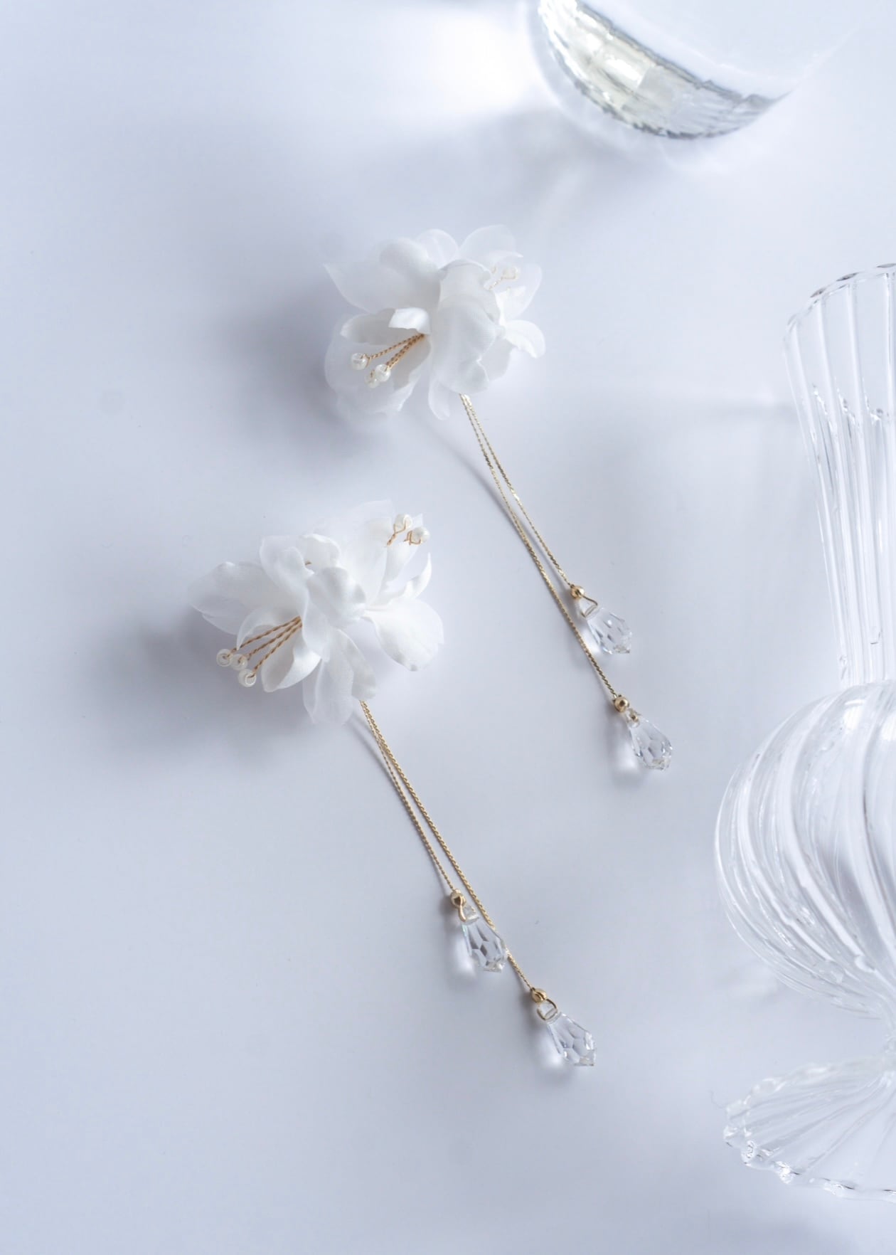 優しい艶のコットンサテンと透け感のあるオーガンジーのお花が上質さと奥行きを出し、透明度の高いプレシオサの美しいクリスタルガラスが動くたびにキラキラと輝く。