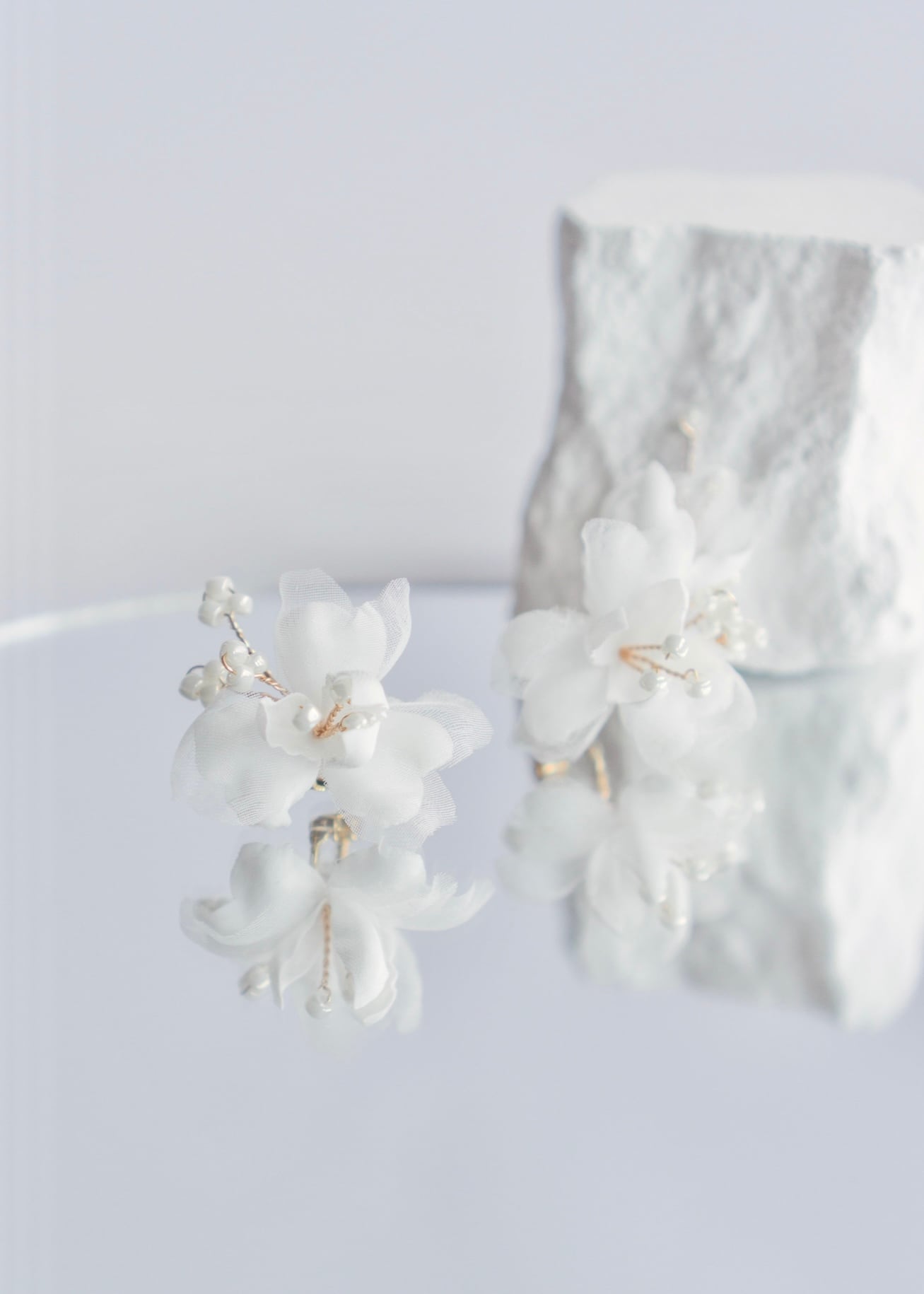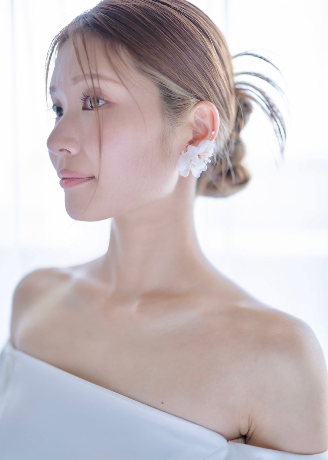 1枚1枚糊付け、カット、コテ当てし丁寧に作り出す美しい曲線と立体感のあるお花のブライダルイヤリング。