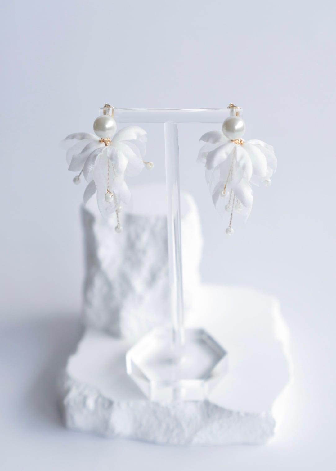 スノーフレークのお花を束ねたように純粋で清らかな美しさと華やかさをプラスしたブライダルイヤリング/ピアス。