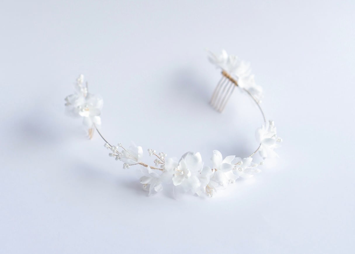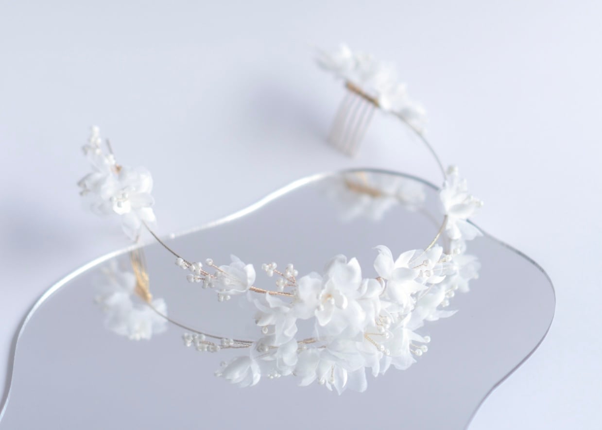 1枚1枚手作業で丁寧に作られた花びらを散りばめて。つぼみから満開まで様々な表情を見せるお花のブライダルバッグカチューシャ。